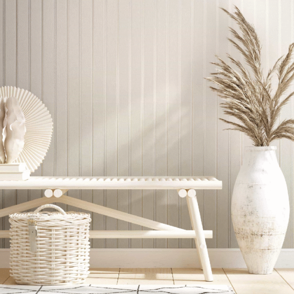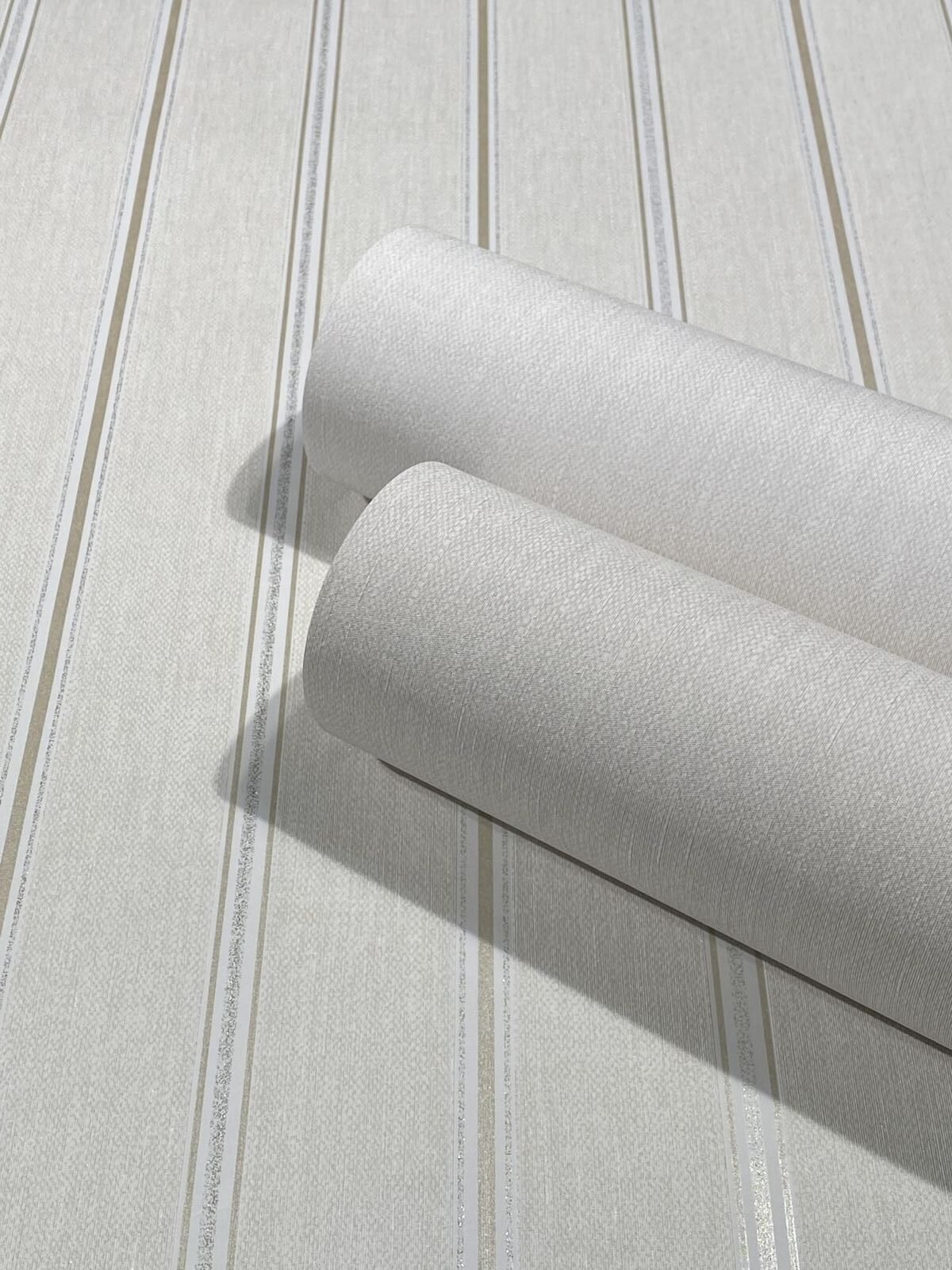With this non-woven wallpaper from the Villa Romana collection, it’s easy to let the flair of the luxurious villas of Rome move in with you. You can give every room an elegant and noble look thanks to the great textile feel and metallic effects. The wallpaper 31578 shows a stripe pattern with metallic effect and glitter in gold on a linen look background in white and cream. Discover the entire collection in our shop!