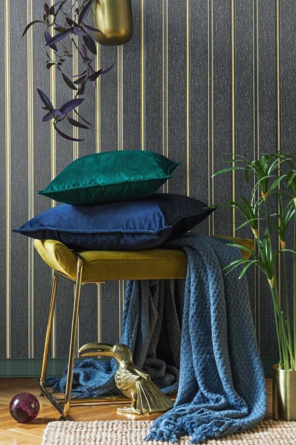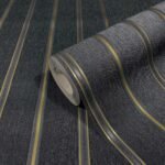 With this non-woven wallpaper from the Villa Romana collection, it’s easy to let the flair of the luxurious villas of Rome move in with you. You can give every room an elegant and noble look thanks to the great textile feel and metallic effects. The wallpaper 31579 features a striped pattern with a metallic effect in gold and glitter in silver on a linen-look background in black. Discover the entire collection in our shop!