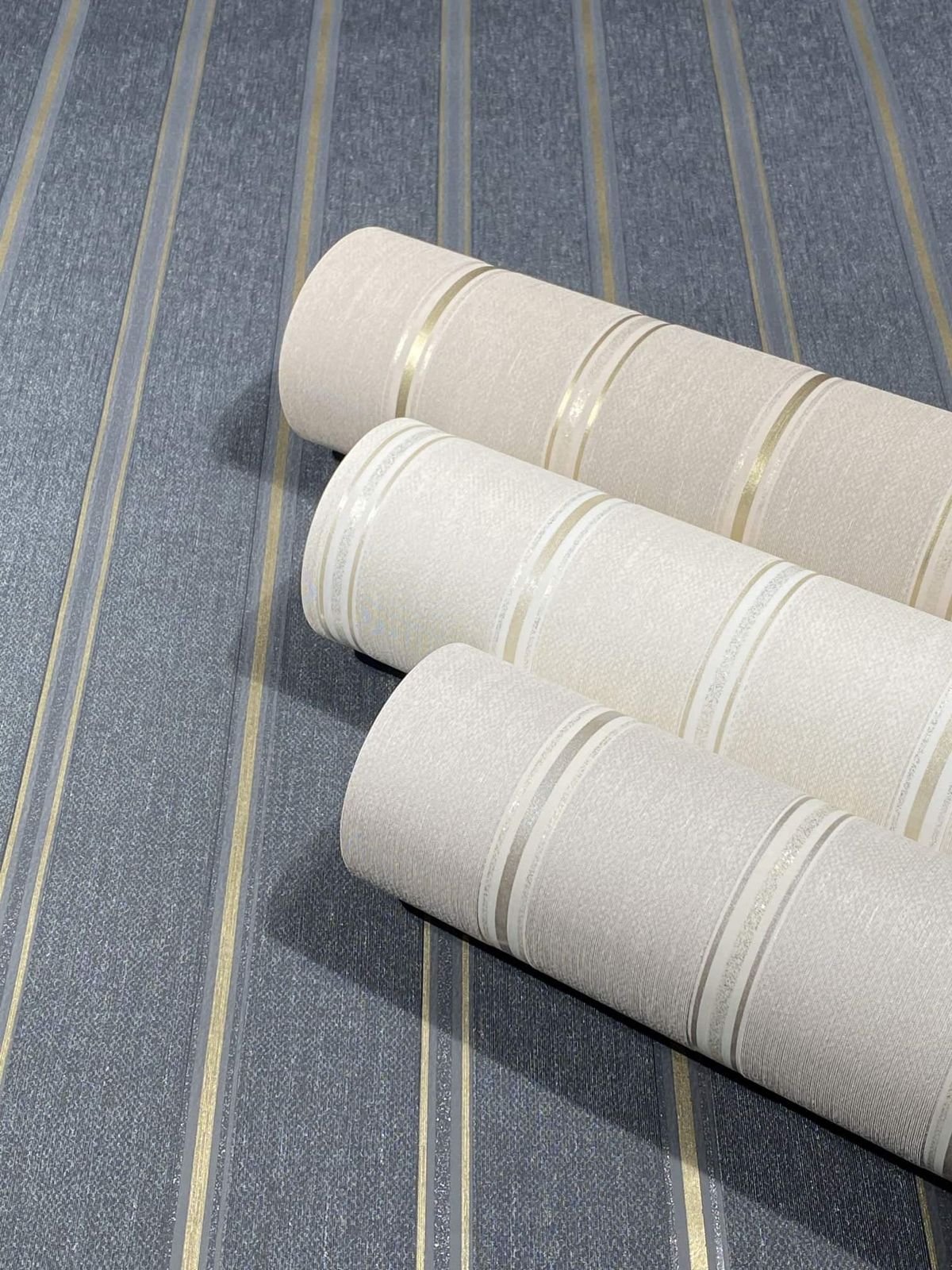 With this non-woven wallpaper from the Villa Romana collection, it’s easy to let the flair of the luxurious villas of Rome move in with you. You can give every room an elegant and noble look thanks to the great textile feel and metallic effects. The wallpaper 31579 features a striped pattern with a metallic effect in gold and glitter in silver on a linen-look background in black. Discover the entire collection in our shop!