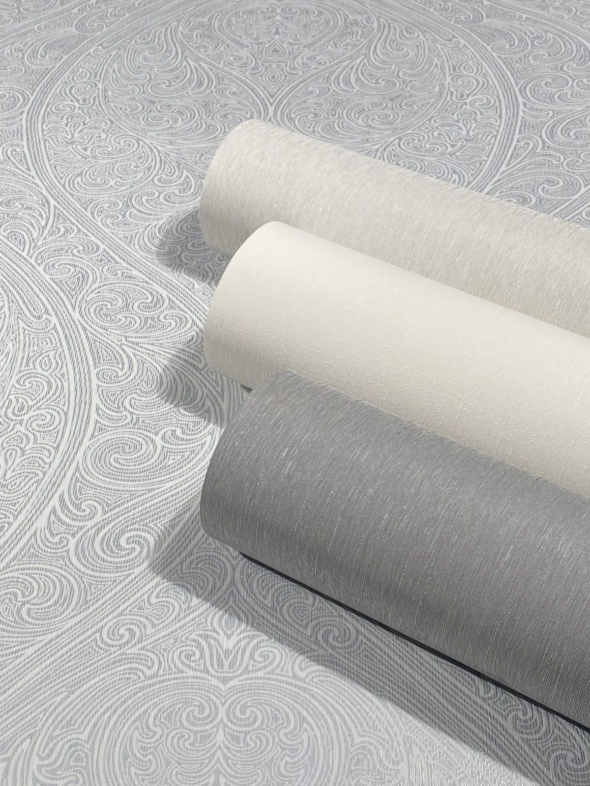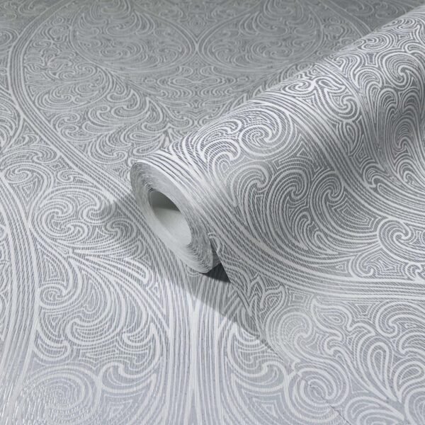 With this non-woven wallpaper from the Villa Romana collection, it’s easy to let the flair of the luxurious villas of Rome move in with you. You can give every room an elegant and noble look thanks to the great textile feel and metallic effects. The wallpaper 32977 features an elegant all-over ornamental pattern with flourishes in white on a background in shades of grey with a metallic effect and silver glitter. Discover the entire collection in our shop!