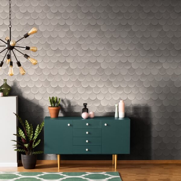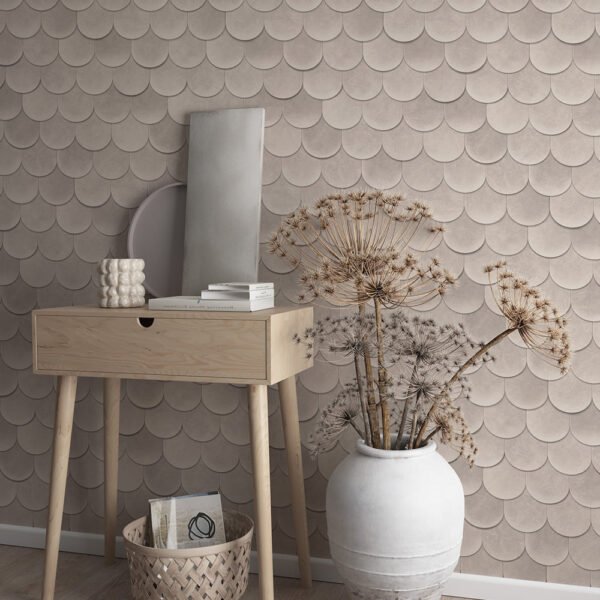 This wallpaper from the Leyla collection by Novamur combines urban chic and Mediterranean lightness and conjures up works of art on your walls. With the wallpaper you can easily bring the lifestyle of Santorini or Miami straight into your home. The non-woven wallpaper 81654 shows a graphic motif with tiles that are reminiscent of roof shingles, with a 3D effect in beige and grey tones. Also discover the other wallpapers in this collection in our shop.