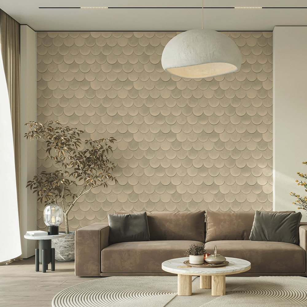 This wallpaper from the Leyla collection by Novamur combines urban chic and Mediterranean lightness and conjures up works of art on your walls. With the wallpaper you can easily bring the lifestyle of Santorini or Miami straight into your home. The non-woven wallpaper 81659 shows a graphic motif with tiles that are reminiscent of roof shingles, with a 3D effect in beige and grey tones. Also discover the other wallpapers in this collection in our shop.