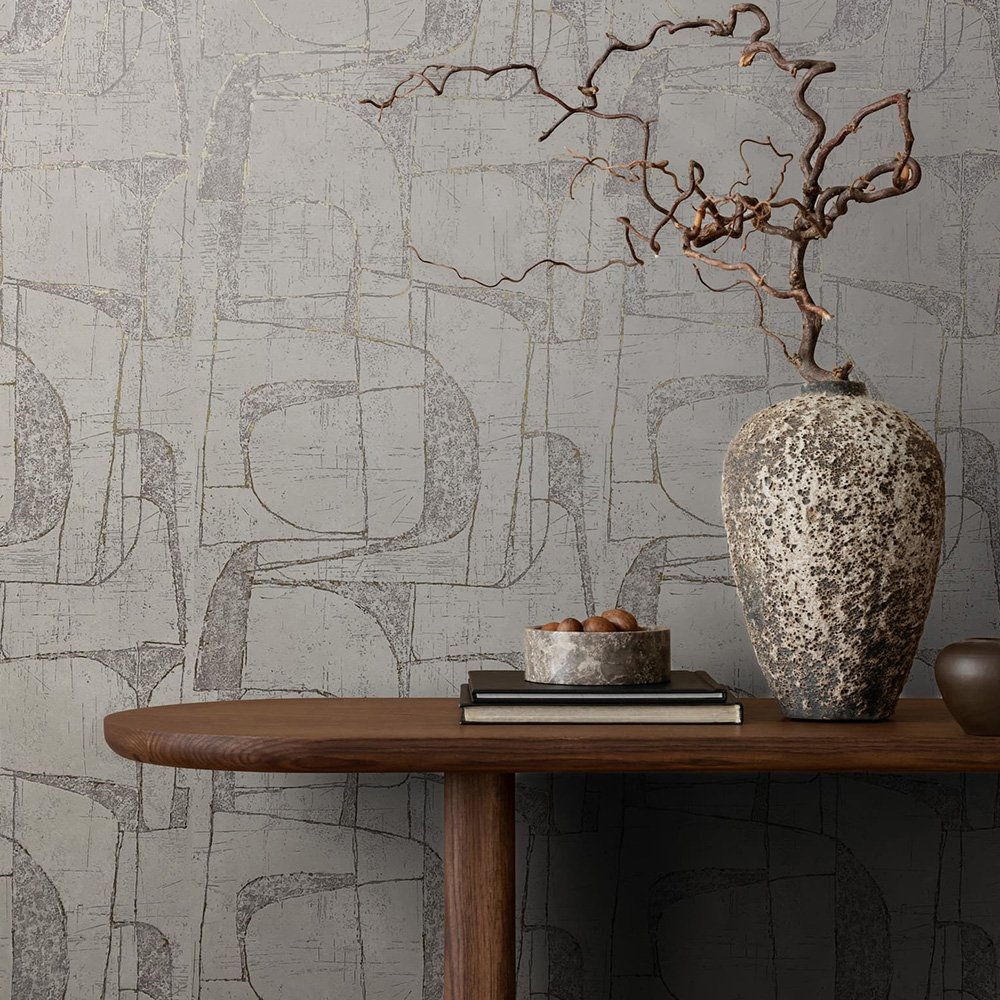 This wallpaper from the Leyla collection by Novamur combines urban chic and Mediterranean lightness and conjures up works of art on your walls. With the wallpaper you can easily bring the lifestyle of Santorini or Miami straight into your home. The non-woven wallpaper 82453 shows an abstract graphic pattern in a used look in beige and grey tones with a subtle metallic effect in gold. Also discover the other wallpapers in this collection in our shop.