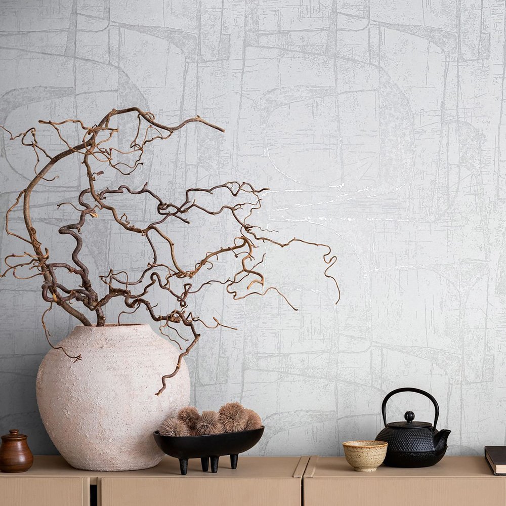 This wallpaper from the Leyla collection by Novamur combines urban chic and Mediterranean lightness and conjures up works of art on your walls. With the wallpaper you can easily bring the lifestyle of Santorini or Miami straight into your home. The non-woven wallpaper 82451 shows an abstract graphic pattern in a used look in grey and cream tones with a subtle metallic effect in silver. Also discover the other wallpapers in this collection in our shop.