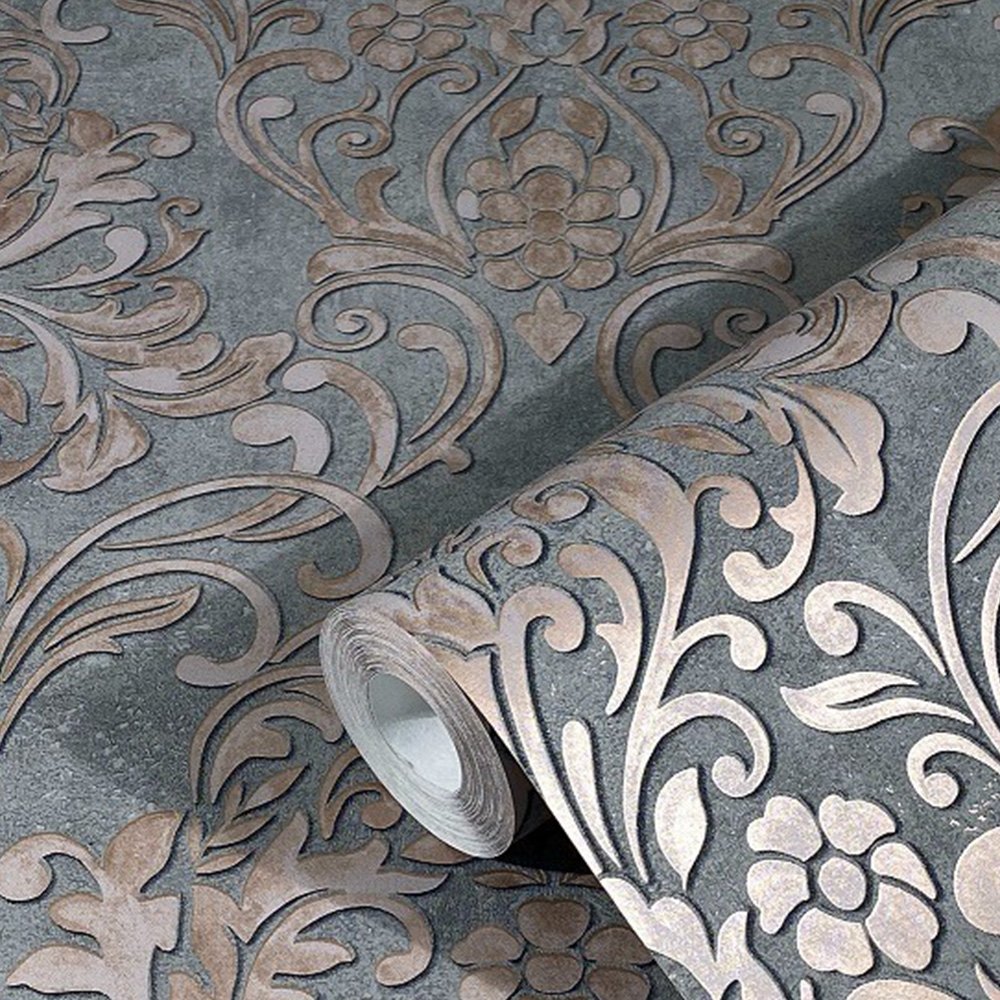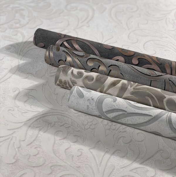 Glamorous metallic effects are combined with concrete and graphic designs from the industrial look in the non-woven wallpaper collection “City Glam” from Marburg. So this collection is an allrouder, which also combines baroque ornaments with a plasters look, which creates a great overall picture on the wall. The wallpaper 32604 with ornaments in baroque design in grey, pink with metallic effect sets cosy accents and invites to stay.