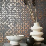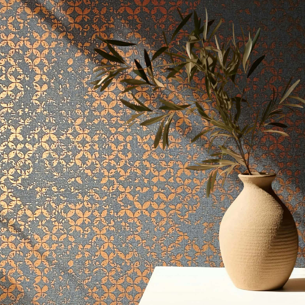 Immerse yourself in a world full of splendor and atmosphere of bygone times. With this wallpaper from Marburg from the City Romanca collection, you can bring the elegance and romance of historical palaces into your home. The non-woven wallpaper. 35119 shows a graphic motif with circles in a used look on a textile-look background in grey tones with a metallic effect in copper. Also discover the other wallpapers in this collection in our shop.