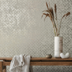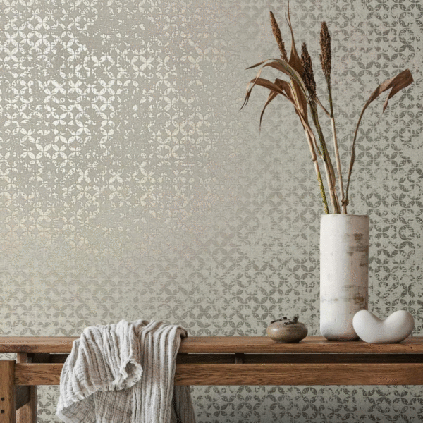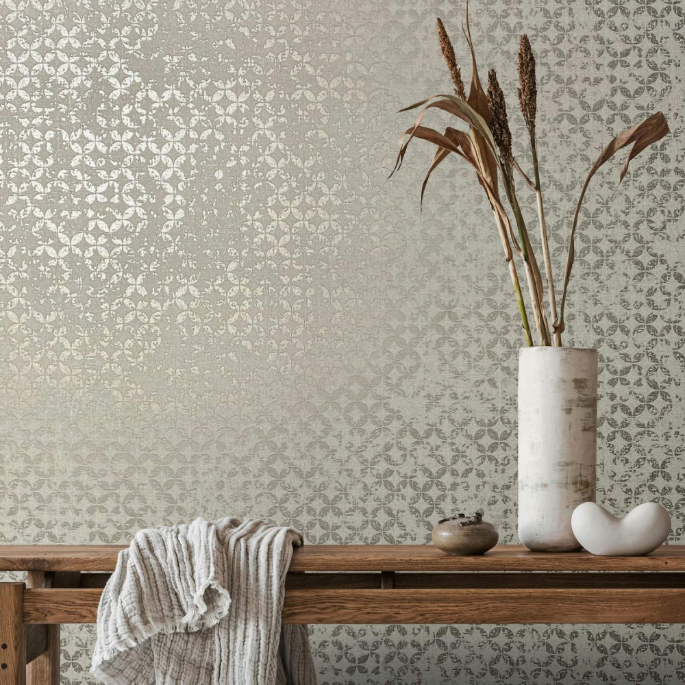 Immerse yourself in a world full of splendor and atmosphere of bygone times. With this wallpaper from Marburg from the City Romanca collection, you can bring the elegance and romance of historical palaces into your home. The non-woven wallpaper. 35118 shows a graphic motif with circles in a used look on a textile-look background in grey tones with a metallic effect in silver. Also discover the other wallpapers in this collection in our shop.
