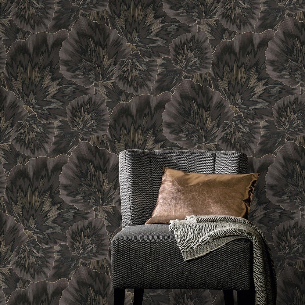 This elegant wallpaper from Erismann from the Spotlight 2 collection is like haute couture for your walls. Every room becomes a center of glitz and glamor, filling your everyday life with the splendor and excitement of a gala night. The non-woven wallpaper 10402-15 shows a pattern with abstract leaves that look as if they were marbled in brown tones with a metallic effect in gold. Also discover the other luxurious wallpapers in this collection in our shop.