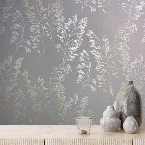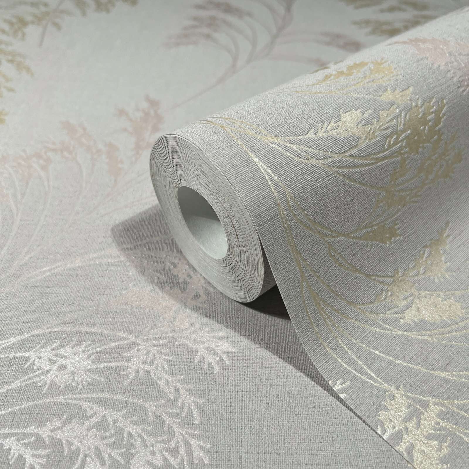 Bring a breath of fresh air into your home with this non-woven wallpaper from the Jackie collection by Novamur. Inspired by the metropolises of Bahia, Riga, Lisbon and New York, the designs in the collection pick up on a wide variety of trends. The wallpaper 82343 has a floral motif with filigree wild grasses with a metallic effect in gold and pink on a plain linen-look background in shades of grey. Discover the entire Novamur wallpaper collection in our shop now.