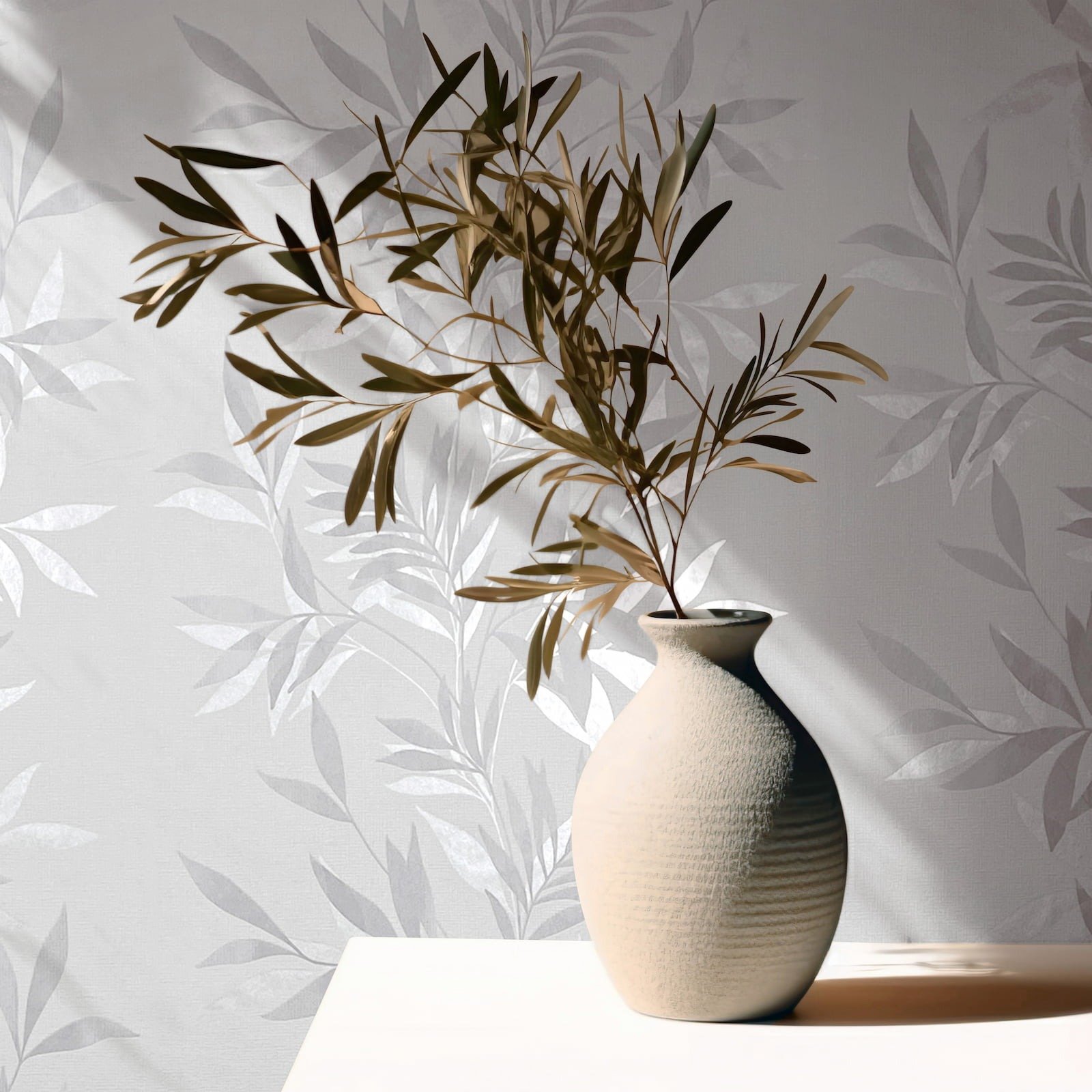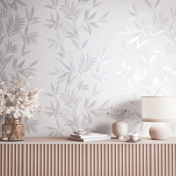 With this wallpaper from the Leyla collection by Novamur, you can easily add elegant accents to your home. The wallpaper combines high-quality materials with a modern and stylish character to give your rooms a harmonious atmosphere. The non-woven wallpaper 82460 features a leaf pattern with tendrils in white and shades of grey with a metallic silver effect. Discover the other wallpapers from this collection in our shop.