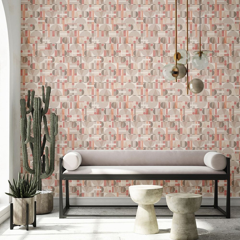 This wallpaper from the Leyla collection by Novamur combines urban chic and Mediterranean lightness and conjures up works of art on your walls. With the wallpaper you can easily bring the lifestyle of Santorini or Miami straight into your home. The non-woven wallpaper 81644 shows a graphic pattern with various shapes such as circles and triangles in a concrete look in beige, red and grey tones. Also discover the other wallpapers in this collection in our shop.