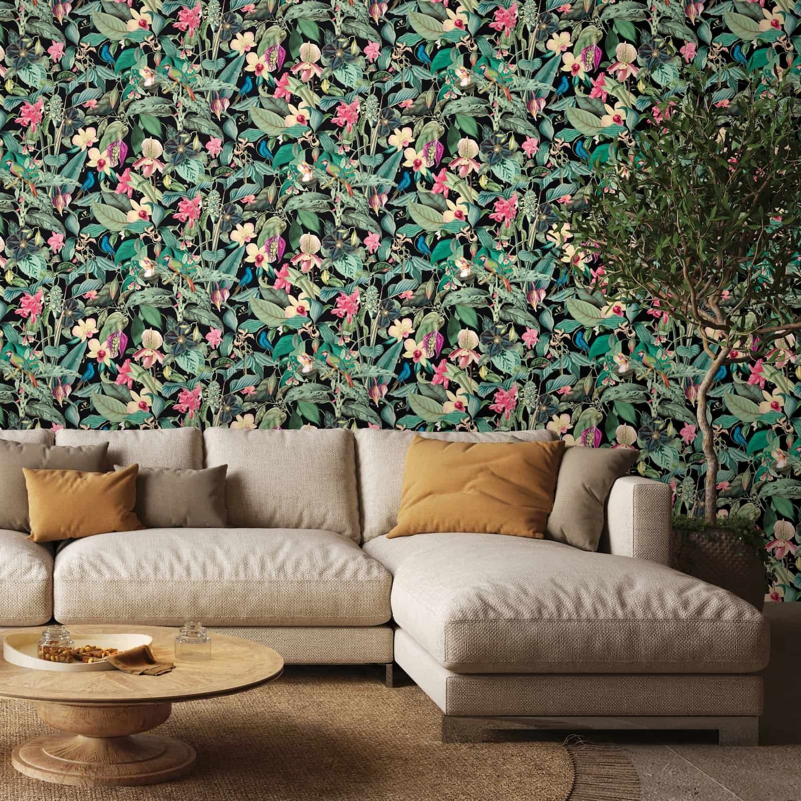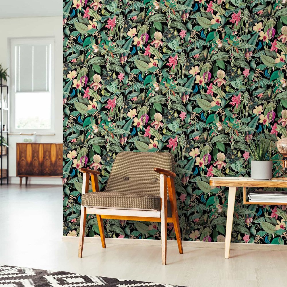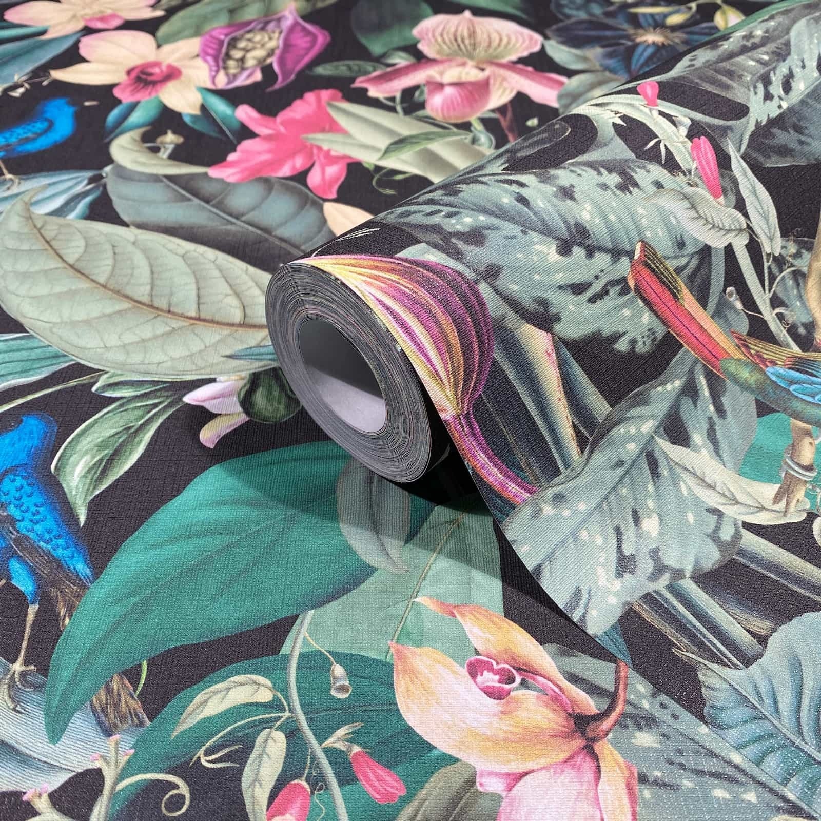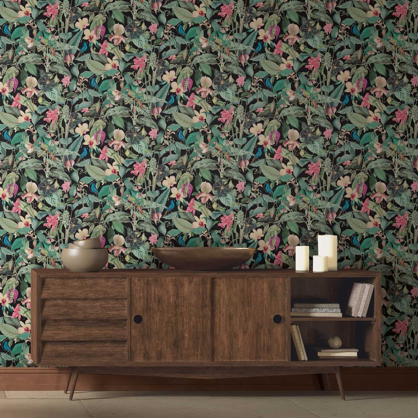 With this wallpaper from the Leyla collection by Novamur, you can easily add elegant accents to your home. The wallpaper combines high-quality materials with a modern and stylish character to give your rooms a harmonious atmosphere. The non-woven wallpaper 81685 features a tropical motif with various flowers and leaves in shades of black, green, and pink. Discover the other wallpapers from this collection in our shop.