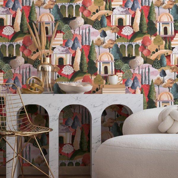 This wallpaper from the Leyla collection by Novamur combines urban chic and Mediterranean lightness and conjures up works of art on your walls. With the wallpaper you can easily bring the lifestyle of Santorini or Miami straight into your home. The non-woven wallpaper 81662 shows a motif with a Mediterranean garden that looks like a painting in green, red and beige tones. Also discover the other wallpapers in this collection in our shop.