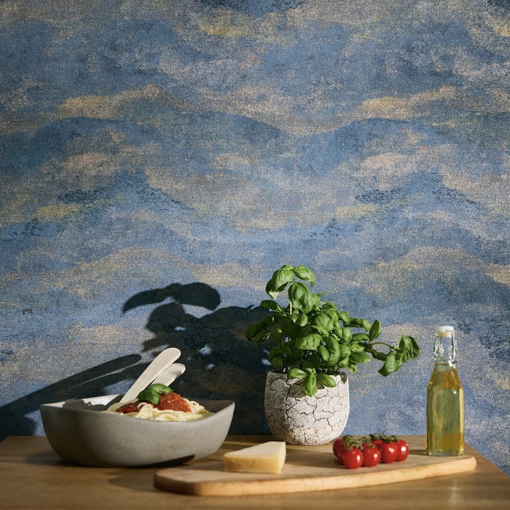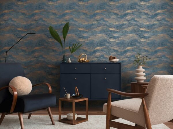 You can easily bring the urban flair of pulsating metropolises into your home with this wallpaper from the Metropolitan Stories – Hot Spots collection. It exudes a touch of magic that creates a new world in your home and makes you think of vacation. The non-woven wallpaper 78656-1 has a concrete look with an abstract wave pattern and a subtle texture in shades of blue with a subtle metallic effect in gold. Also discover the other wallpapers in this collection in our shop.