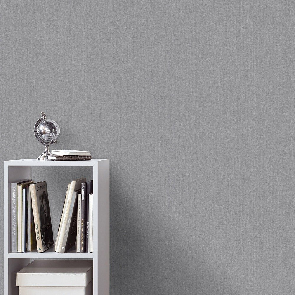This elegant wallpaper from Erismann from the Spotlight 2 collection is like haute couture for your walls. Every room becomes a center of glitz and glamor, filling your everyday life with the splendor and excitement of a gala night. The non-woven wallpaper 10437-47 is plain in textile look with a longitudinal texture in grey tones with a subtle metallic effect in silver. Also discover the other luxurious wallpapers in this collection in our shop.