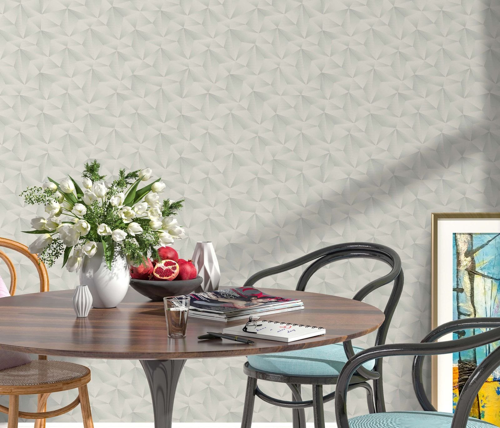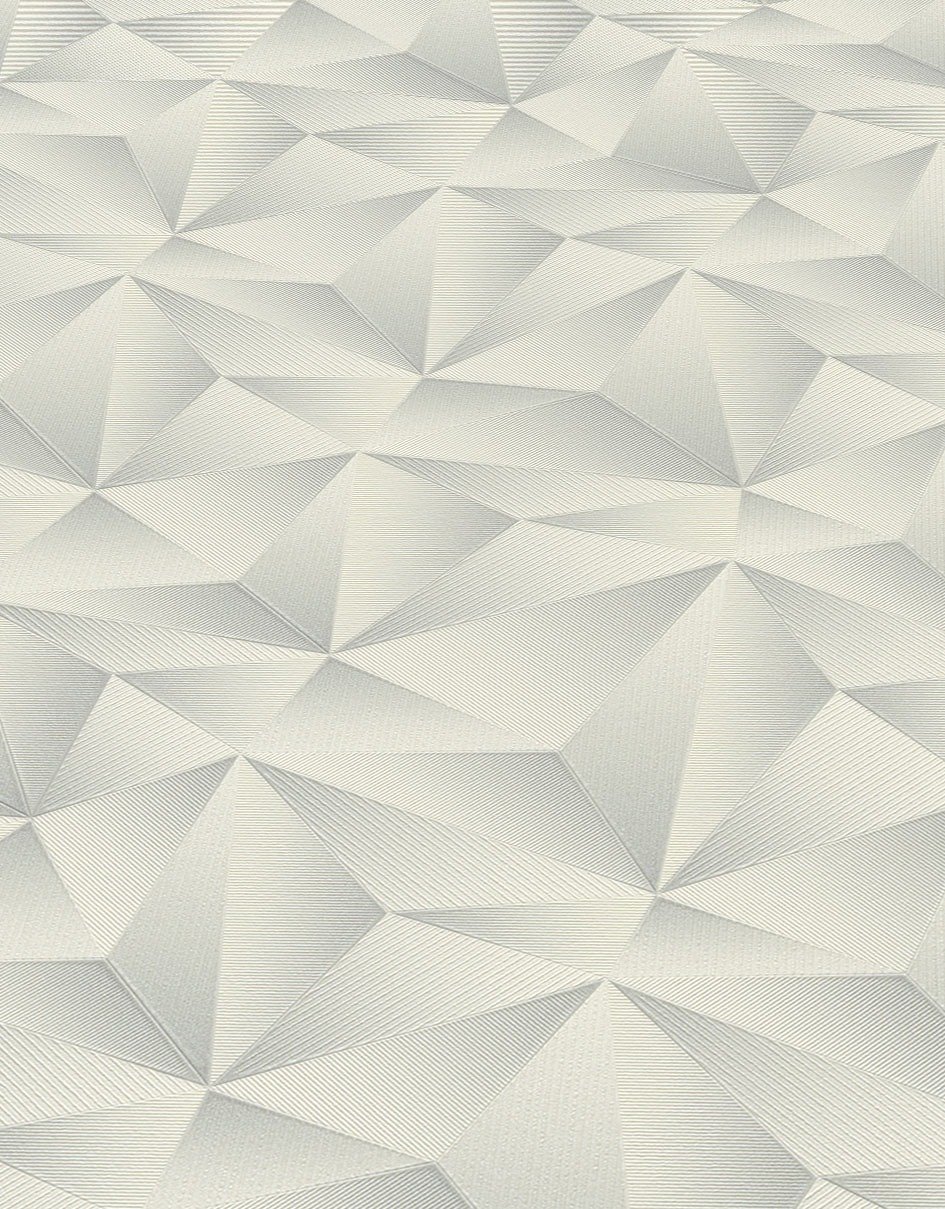 Anything but old-fashioned is the non-woven wallpaper collection from Erismann with the Spotlight series. Expressive patterns, natural leaf motifs and classic stripes combined with metallic effects in timelessly chic colours skilfully set the scene in any room. When mixed with a colour-coordinated plain, particularly charming contrasts are created. The wallpaper 10106-31 features a triangular pattern with 3D effect in shades of grey.