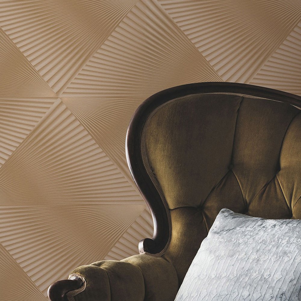 This elegant wallpaper from Erismann from the Spotlight 2 collection is like haute couture for your walls. Every room becomes a center of glitz and glamor, filling your everyday life with the splendor and excitement of a gala night. The non-woven wallpaper 10404-30 shows a motif with triangles, which have a 3D effect that is reminiscent of a fan in gold with a metallic effect. Also discover the other luxurious wallpapers in this collection in our shop.
