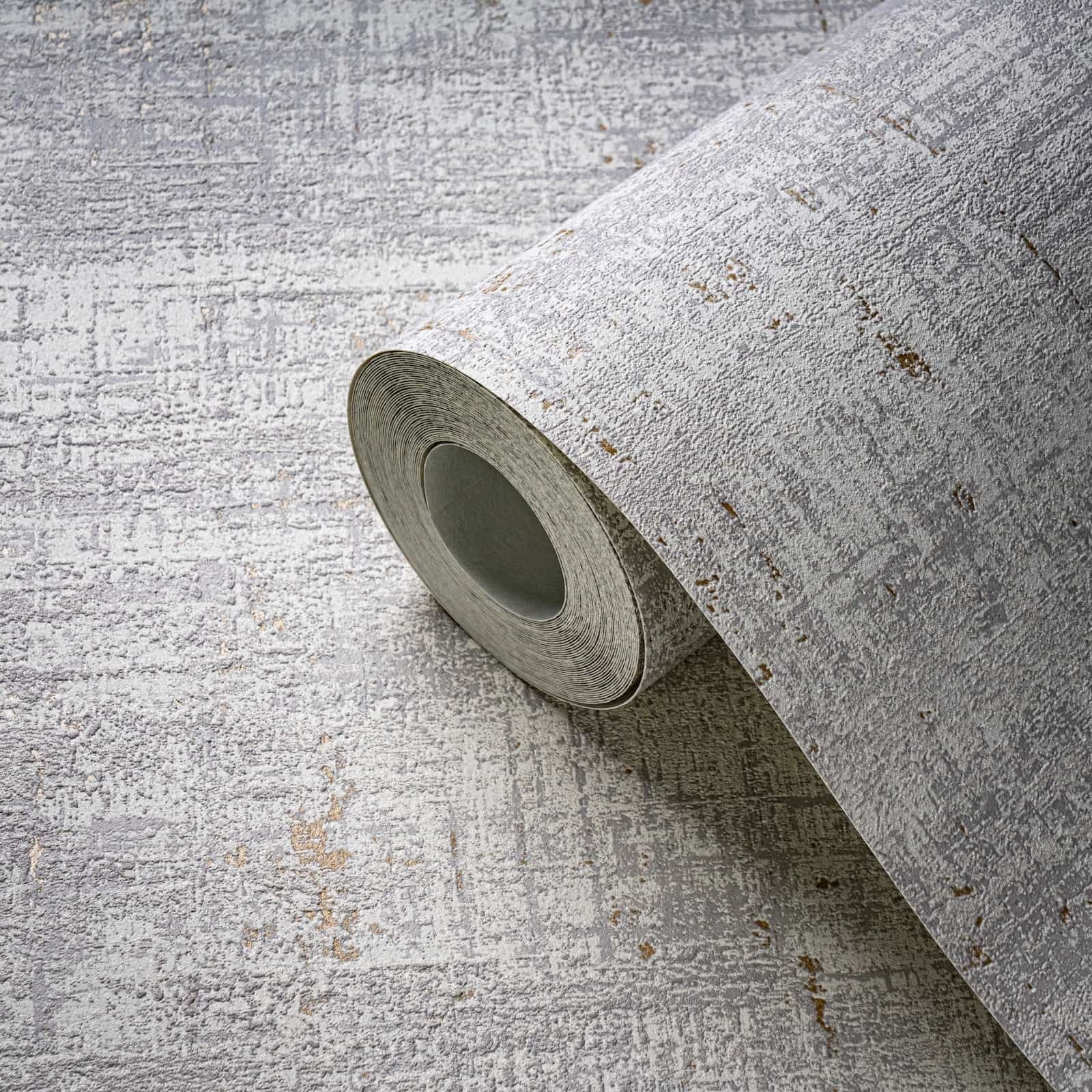 This wallpaper from the Stories of Life collection by livingwalls gives your four walls a stylish and modern ambience. The wallpaper is perfect for creative wall design if you want to give your rooms an individual touch. The non-woven wallpaper 39657-3 has a plastered look in a used look with a texture in grey tones with a metallic effect in gold. Also discover the other wallpapers in this collection in our shop.