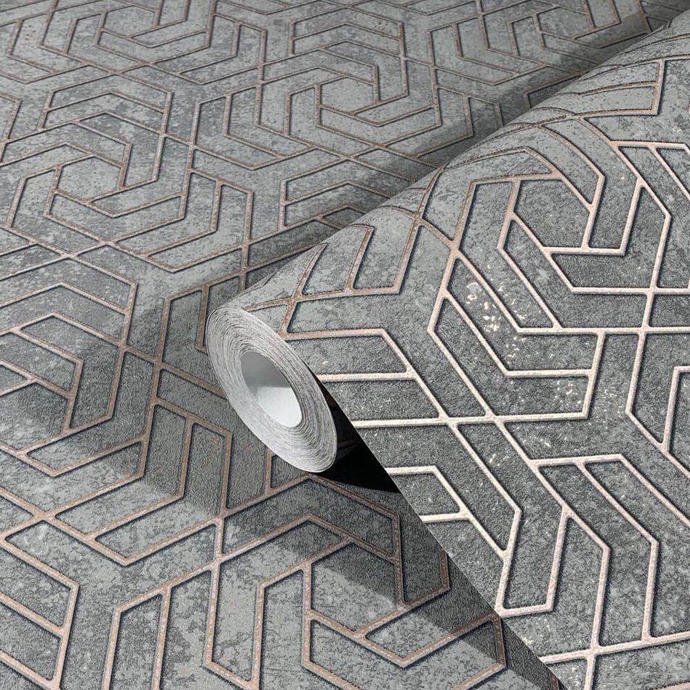 Glamorous metallic effects are combined with concrete and graphic designs from the industrial look in the non-woven wallpaper collection “City Glam” from Marburg. So this collection is an allrouder, which also combines baroque ornaments with a plasters look, which creates a great overall picture on the wall. The wallpaper 32609 in graphic design with 3D effect in grey, pink with metallic effect sets cosy accents and invites to stay.