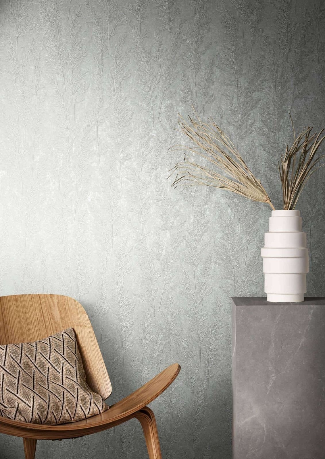 Sustainable living is an acute issue that we all need to be engaged with. Designer Felix Diener also picks up on this theme in his Natural Opulence collection. With the help of natural materials he has created wonderful patterns. The Wallpaper 85735 with grasses plants in white-grey shines elegantly in its metallic effect and invites you to relax.